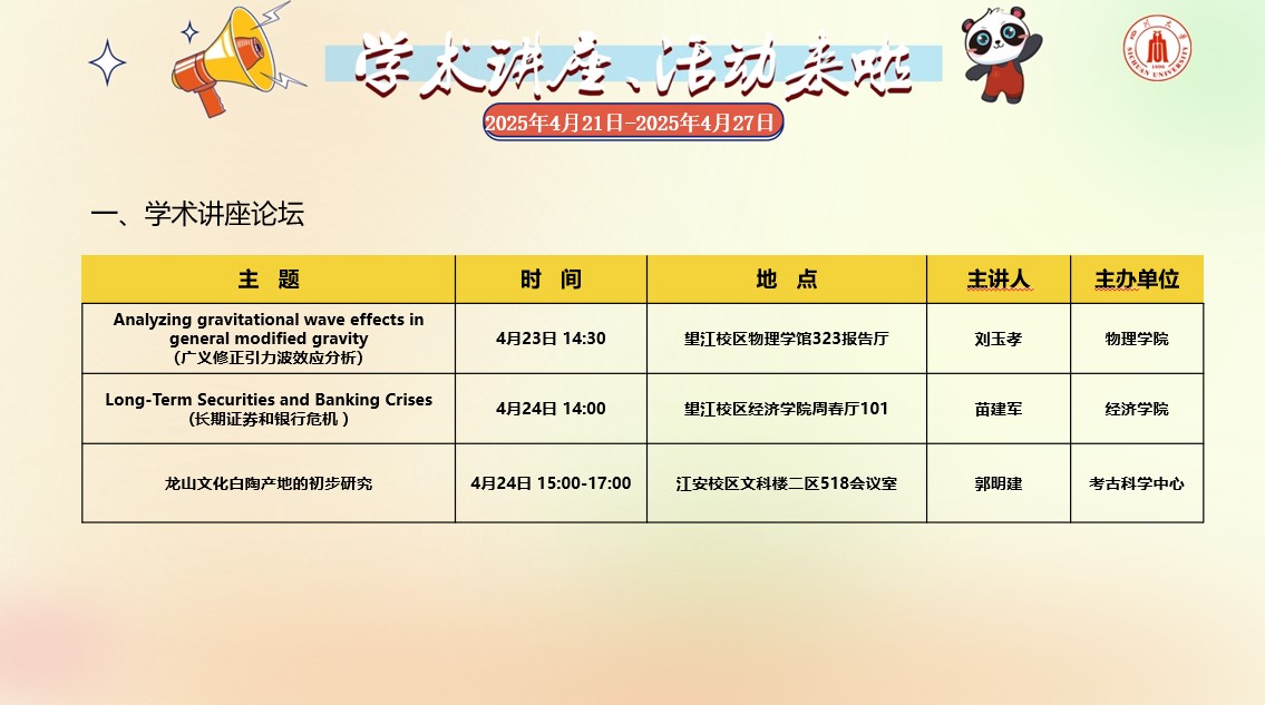 太阳成集团tyc151cc2025年4月21日-4月27日学术讲座论坛及校园文化活动预告