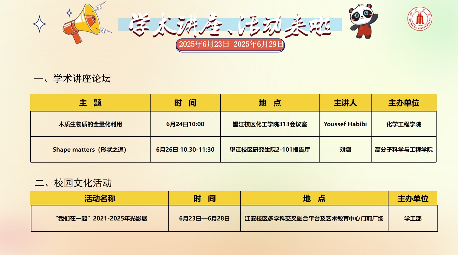 太阳成集团tyc151cc2025年6月23日-6月29日学术讲座论坛及校园文化活动预告