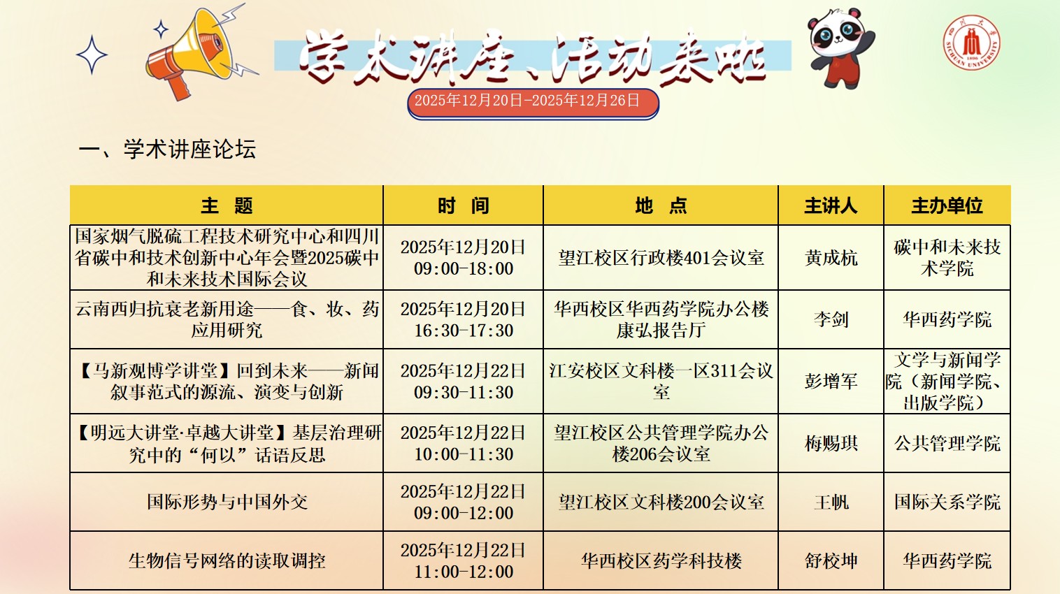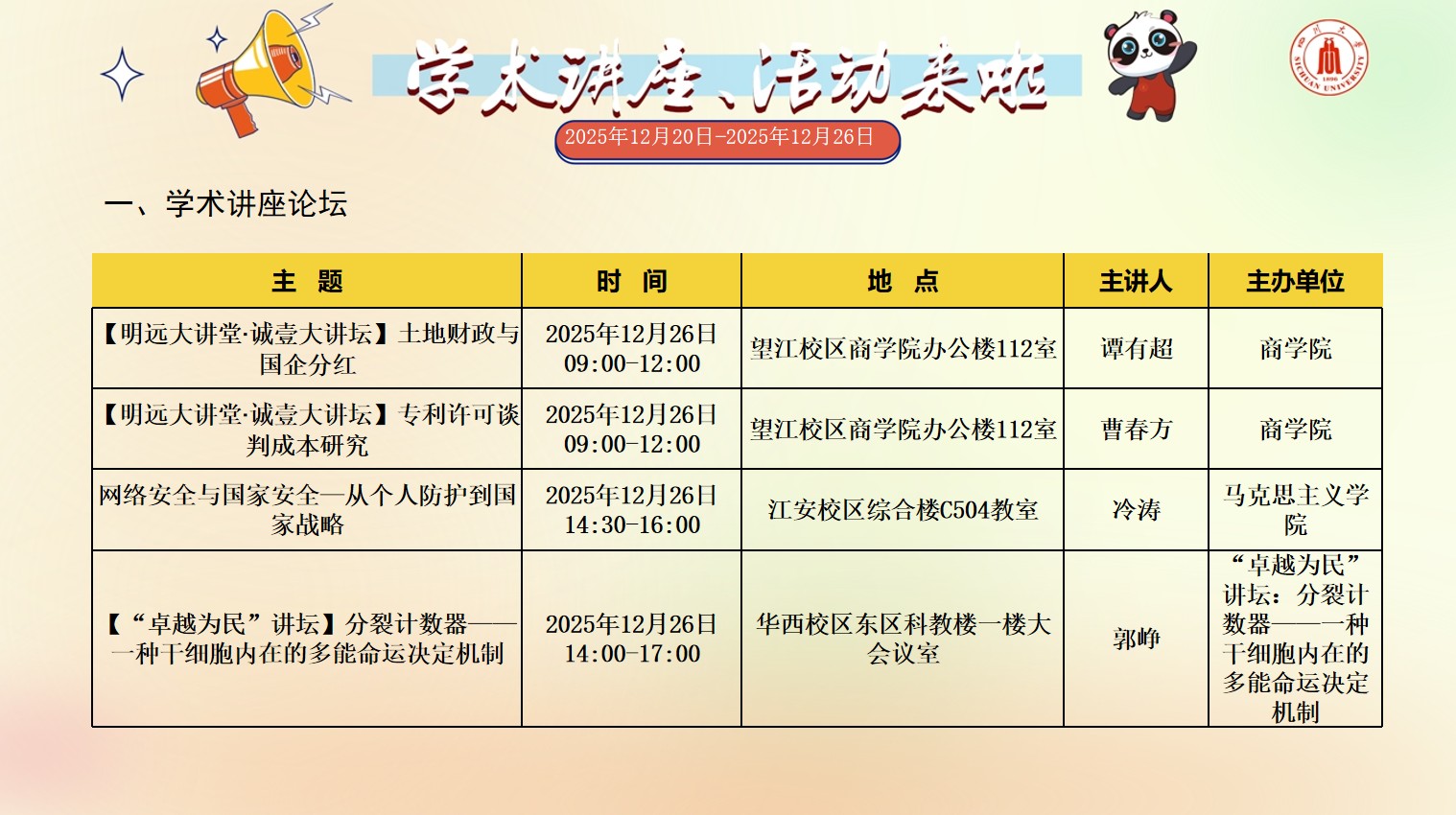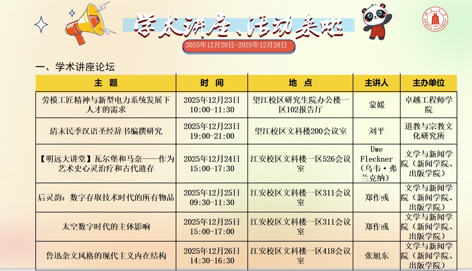 太阳成集团tyc151cc2025年12月20日-12月26日学术讲座和校园文化活动预告