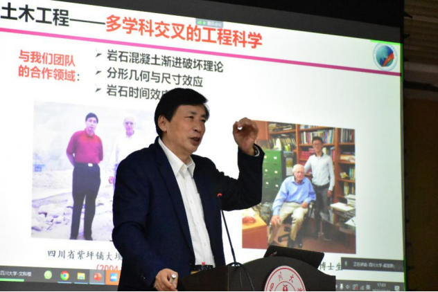 讲授中,谢和平院士以都江堰水利工程为例,阐释了水利与哲学天人合一的思想;以埃及胡夫金字塔为例,阐释天文、力学、数学学科在陵墓建造中的应用;以卡帕多西亚地下城为例,阐释世人在对地下空间开发利用中的创新精神。以莫尼埃发明钢筋混凝土、弗雷西内发明预应力混凝土、伽利略提出悬臂梁理论、达西提出达西定律、欧拉提出压屈公式、钱伟长提出薄壳分析的统一理论等事例,娓娓阐释了土木工程学科发展史及对在推进人类文明进程中的作用。谢和平指出,土木工程是多学科交叉的工程学科,具有艺术性、创造性、多学科交叉性与探索性的特点,土木工程人才培养要求有扎实的多学科知识基础和广阔的学科视野。他教育同学们学会发现问题、思考问题,引导他们加深对创新的理解,鼓励同学们传承老一辈科学家的精神。