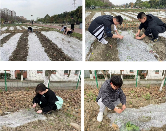 活动正式开始。同学们热情高涨,互相合作,分工明确,井然有序地进行开孔、除草、松地等工作。欢声笑语中,各类作物幼苗纷纷从地膜中探出头来,茁壮成长。