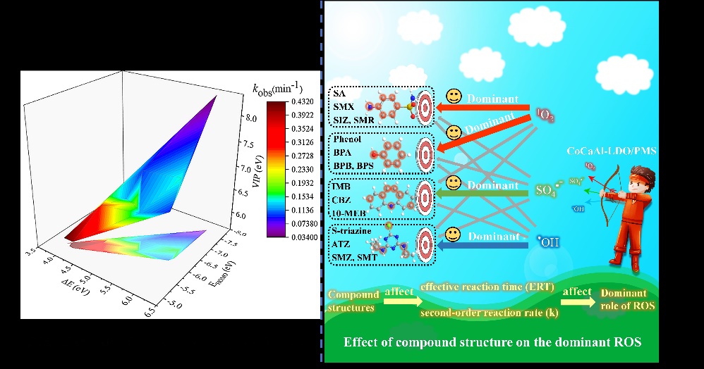获奖论文自发表以来广受关注,目前他引高达150余次,连续多次入选ESI高被引论文和热点论文。论文发现在高级氧化过程中有机污染物分子结构会影响降解速率,揭示了分子结构特征与不同ROS之间的内在作用机制。通过分析不同有机化合物的最高占据轨道能量(HOMO)、最低未占据轨道能量(LUMO)、能隙和垂直电离能等参数,以及各元素的电荷分布和福井函数值,明确了有机污染物的分子结构特征对其降解速率的主导作用,并探明不同分子结构特征的有机化合物在多自由基生成体系中的降解规律。另外,发现污染物的基本母体结构作为ROS的主要攻击位点,导致同类分子结构污染物具有类似的主导自由基和降解速率,有机化合物结构上的物理化学特征会引起与ROS反应过程中有效反应时间和二级反应速率常数的差异,进而影响不同ROS对污染物的反应速率及降解贡献。