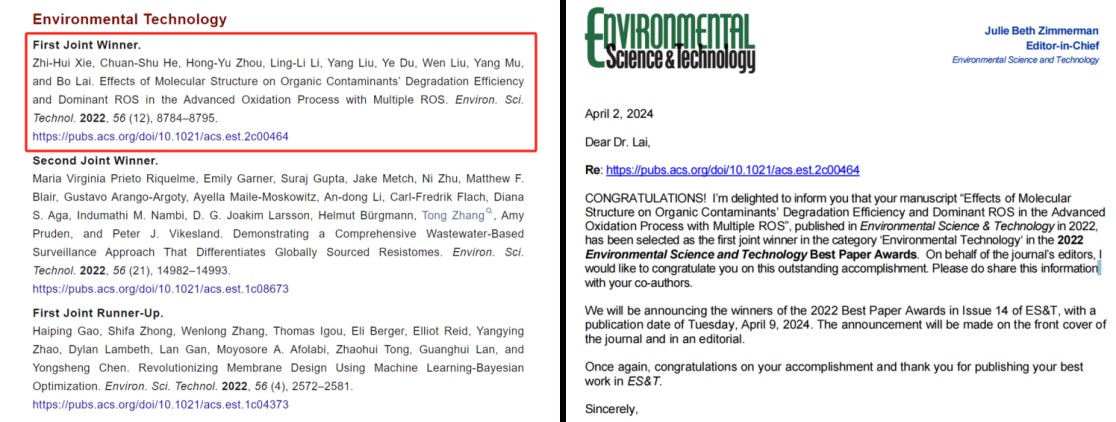 获2022年度环境领域权威期刊ES&T最佳论文奖