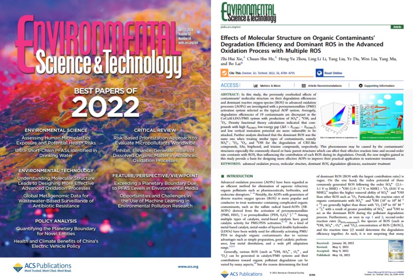 近日,美国化学学会(ACS)旗下环境领域国际顶级期刊Environmental Science & Technology(以下简称ES&T)公布了2022年度最佳论文(Best Papers of 2022)获奖名单。公司环境系博士研究生谢智慧,何传书教授为第一作者,赖波教授为通讯作者的研究论文“Effects of Molecular Structure on Organic Contaminants Degradation Efficiency and Dominant Reactive Oxygen Species (ROS) in Advanced Oxidation Process with Multiple ROS”荣获2022年度ES&T最佳论文奖,在环境技术类(Environmental Technology)文章中排名第一(First Joint Winner)。