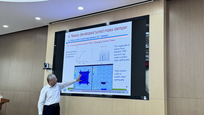 报告中,吕西林结合大量的重大工程案例,介绍了减震(振)和隔震技术研发和工程创新应用,重点介绍了组合隔震、黏滞阻尼墙、调谐质量阻尼器、颗粒阻尼器、非线性能量阱等装置的性能特点、设计方法、工程应用,重点介绍了上海中心等重大工程减振系统的实时监测情况和分析结果,展示了其团队在减隔震领域丰硕的研究成果和领先的抗震技术。
