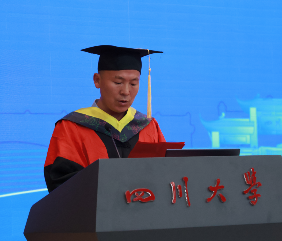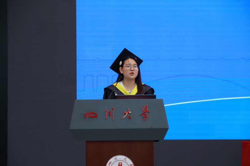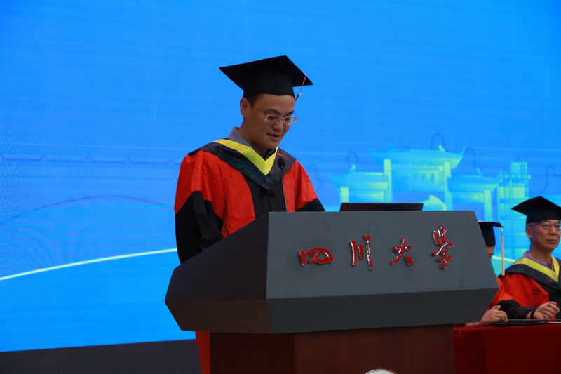 城乡规划专业康澳同学作为研究生毕业生代表发言。他分享了在公司求学八年的故事与选择,感恩母校的老师与同学,表示在奔赴城乡建设与生态保护广袤天地中将坚守初心,在平凡的岗位上挥洒青春热血。