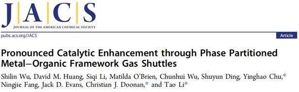 近日,公司楚英豪教教授团队在《Journal of the American Chemical Society》(JACS)在线发表了题为《Pronounced Catalytic Enhancement through Phase Partitioned Metal-Organic Framework Gas Shuttles》的研究性论文。公司环境科学与工程系2021级博士研究生伍世林为论文唯一第一作者,楚英豪教授、阿德莱德大学Tao Li和Christian Doonan教授为论文共同通讯作者,太阳成集团tyc151cc与阿德莱德大学为论文的共同通讯单位。