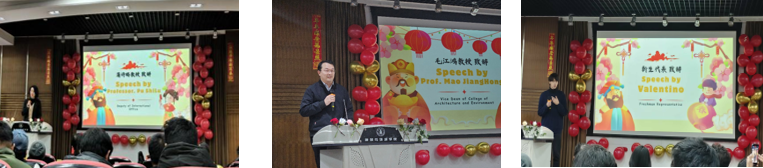 蒲诗璐首先致辞,向参与活动的师生送上新春祝福,充分肯定了举办活动的意义,表示通过晚会将有效促进国际交流与育人、助力新生融入校园,同时搭建中外学子跨文化沟通良好平台,寄语职工们珍惜交流机会、增进彼此情谊、实现共同成长,并对公司为推动国际化校园建设所做的努力表示感谢。