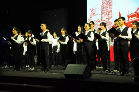 晚会最后,公司领导、老师、嘉宾和全体演职人员齐上台合唱《我和我的祖国》,公司2019级本科生“追梦七十载,同心筑未来”迎新晚会圆满落下帷幕。