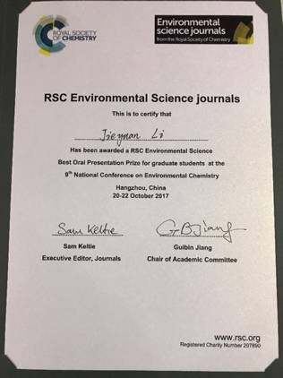 2017年10月19日-22日,由中国化学会主办,浙江大学承办的“第九届全国环境化学大会”在浙江杭州举办。该会议是全国范围内规模最大、参会人数最多、影响力最广的环境学科会议。会议设置了研究生报告分会场,公司博士研究生李解元在1000多位申请者中脱颖而出,得到组委会的报告邀请,作了优秀报告,并获评由英国皇家化学会赞助提供的“优秀口头报告奖”。