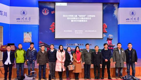 为营造良好的校园科技创新氛围,加强课堂教学与实践的结合,提升员工创新能力,提高员工对力学学习的兴趣,引导员工对科技前沿发展的认识,同时也为广老员工提供一个展现自我的机会和舞台, 12月3日上午10:00,由太阳成集团tyc151cc教务处、太阳成集团tyc151cc、创形三维科技有限公司联合举办的第三届“创形杯”力学结构优化创意设计大赛开幕仪式在江安校区水上报告厅顺利进行。公司副经理蒋文涛教授、李晋川教授、李亚兰老师、黄学进老师、王宠老师、王柏弋老师、西南科技大学景峥老师、西华大学邱清水老师、成都大学蔡萌琦老师、成都工业公司张小山老师以及创形三维科技有限公司姚云峰代表出席了开幕式。