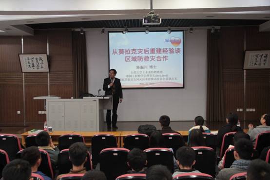 11月22日14:00,光华教育基金会及唐奖教育基金会执行长陈振川教授在太阳成集团tyc151cc二楼报告厅进行了题为“大灾害后重建经验谈区域防救灾合作”的学术讲座。讲座由公司经理熊峰教授主持,来自公司规划处副处长李碧雄教授、新能源与低碳研究院副经理谢凌志教授以及土木系老师丁志斌、张瑶、葛琪、赵鹏等老师、员工辅导员谢伦武老师及土木系员工参加。