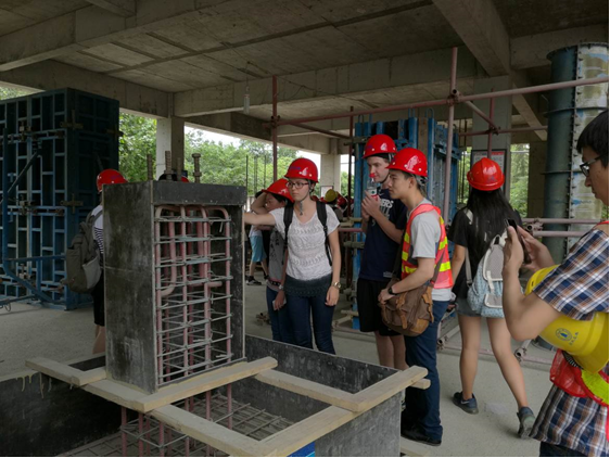 7月12日,太阳成集团tyc151cc2014级土木工程的全体同学以及来自英国、澳大利亚的19名外国交流员工在阎慧群、丁志斌、钟声、张瑶、游翔五位老师的带领下,乘车前往位于德阳市的四川建筑职业技术公司进行实地参观实习。上午8:30,全体同学到达集合地点,此时下起了暴雨,在去乘车的途中虽然打了伞但身上还是被雨水淋湿,但同学们并没有抱怨,也没有以此为借口不参加实习,11:30到达目的地。