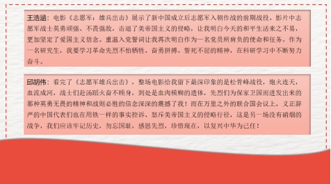影片还原了抗美援朝这段可歌可泣的历史,一幕幕感人至深的场景、一句句铿锵有力的誓言,展现了那个时代中华儿女的勇气和担当,诠释了来之不易的和平,深深地打动了现场观影的每一位同志。英雄的故事值得永传,伟大的精神更值得弘扬。影片结束后,怀着激动的心情,全体党员重温入党誓词。誓词的每一句话都有了更清晰的注解,由无数先辈鲜血换来的和平需要珍惜,新时代研究生党员的责任担当意识也更加强烈!