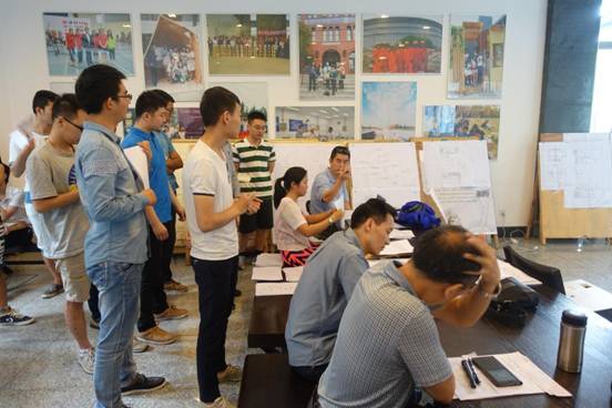 随后,根据联合毕业设计分组情况采用类似招投标汇报方式,依次按照每一组的建筑、结构、给排水、暖通以及造价的专业顺序进行分组布展和答辩。先请建筑专业同学总结了项目近半年来的推进过程以及其中的协调成果,并且针对性地展示了协调配合过程中方案的逐步调整以及细节的完善成果;然后结构专业同学针对每栋建筑从结构选型、结构设计计算以及结构与其他相关专业的协调等方面展示自己的设计成果;接着依次由给排水专业、暖通专业、造价专业的同学进行方案设计以及最终图纸的展示。所有专业的同学在讲解过程中着重展示了整个跨专业配合过程中所遇到的问题以及最终协调的结果,紧扣本次毕业设计的主题。