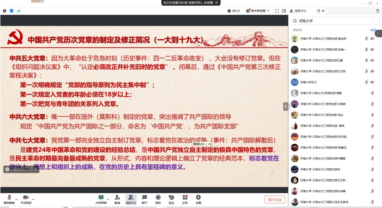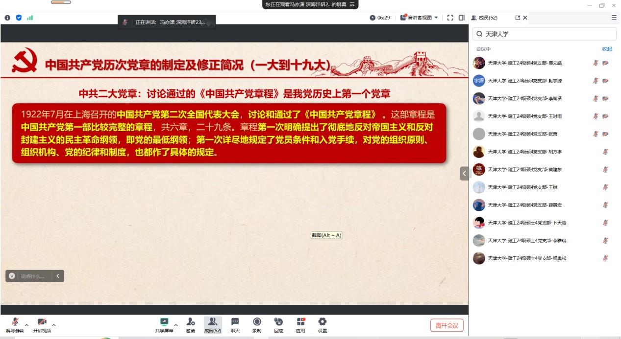 为深入学习贯彻党的二十大精神,推动高公司党支部间的交流共建,2025年1月3日,研究生土木二支部联合清华大学国际研究生院深海洋研233党支部、国际研究生院深海洋研43党支部、北京大学基础医公司药理学系研究生党支部、天津大学建筑工程公司24级硕4党支部和河海大学水文水资源公司2023级水文三班硕士研究生党支部,共同举办 “学党章,明党史,守党纪”专题活动。