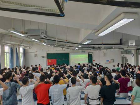 2017级团员同学们齐唱国歌,重温入团誓词,认真观看了钱学森坚决回到祖国、报效祖国的视频。学习中,同学们被科学家放弃名利金钱,突破重重阻拦回国为国家科技事业奋斗的场景深深感动,立志学习科学家的家国情怀与爱国热情。团员代表在“团旗下的演讲”活动中声情并茂,饱含激情,热情洋溢的演讲收获了阵阵掌声。许多同学自发地在“青春心向党•建功新时代”海报上签名并写下了自己的寄语和祝愿。
