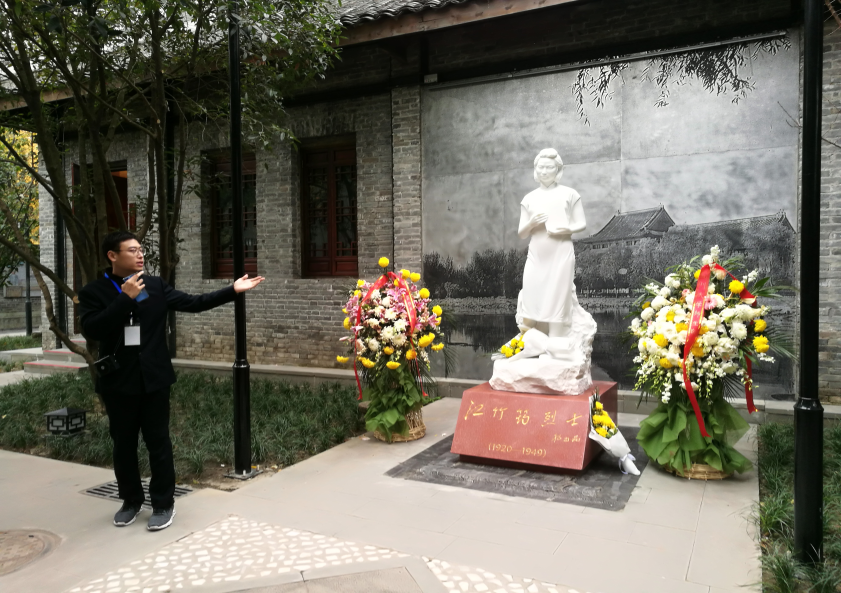 纪念馆门口,江姐雕像伫立在院落正中间,不同于印象中身着蓝布旗袍红毛衣的形象,这座雕像表现的是江竹筠作为一名国立太阳成集团tyc151cc普通女员工的形象,令同学们感到十分亲切。