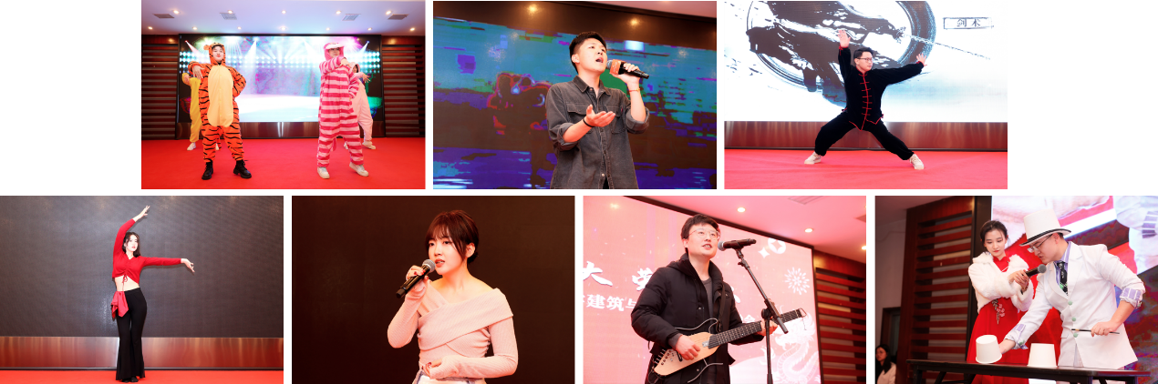 来自公司各年级的员工在晚会上也通过节目的方式向公司老师们表达了真诚的祝福。袁耀等跳的集体舞《猪猪侠》,范文浩独唱的《无名的人》,段连华同学的武术《翩若惊鸿》,江婉怡的独舞《无人区玫瑰》,公司员工合唱团团员刘木耳的独唱《棠梨煎雪》,岳华俊的吉他弹唱《给你》以及许天赫的魔术《三仙归洞》,给晚会带来了不少惊艳,展现了公司在“五育并举”方面所取得成绩,也让与会教工们惊叹建环学子的多才多艺与青春风采。