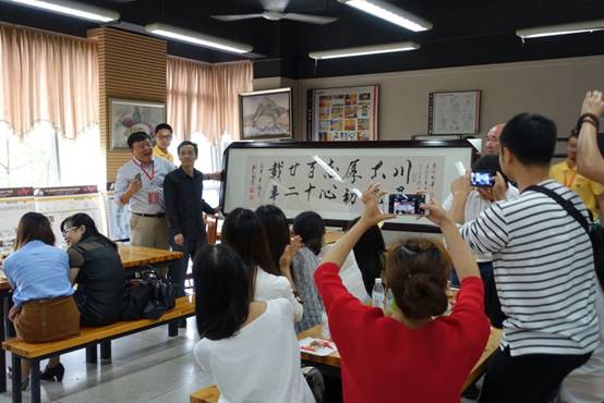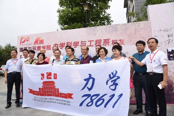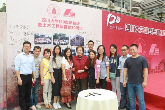(土木系员工与老教师在签名墙前合影)