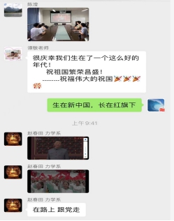 此外,公司师生通过多种形式在实验室、办公室、宿舍等收看庆祝大会。公司土木系石宵爽老师在家里,带着女儿一起观看直播并分享了学习心得,表示“我心向党,童心向党”,通过自己的言传身教,教育孩子爱国爱党爱人民。国家海外高层次人才引进计划特聘教授、力学系赵春田老师在观看直播时感叹,“在路上,跟党走”。建筑系谭敏老师通过公司微信群分享了自己的激动心情,表达了自己对祖国的祝愿。