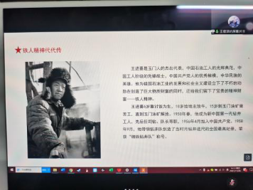 王熠泽以王进喜相关小视频开场,结合王进喜的生平诠释了铁人精神的内涵,即“为国分忧、为中华民族争气”的爱国主义精神、为了革命“有条件要上,没条件创造条件也要上”的无私奋斗精神、“宁肯少活二十年,拼了命也要取得大油田”的无我拼搏精神、“要为油田负责一辈子”的求真务实精神。他指出铁人精神是我们凝心聚力,推动社会主义事业发展的不竭动力。研究铁人精神,继续挖掘铁人精神的丰富内涵,有助于培育更多创造时代伟业的新力量!
