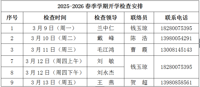 为确保新学期本科教学工作有序开展、保证高标准教学质量,公司在2025—2026学年春季学期,持续加强教学监控与管理,严格按照公司教务处关于开展开学教学检查工作的文件精神和工作要求,组织公司领导班子、教学管理人员、教学督导人员对公司开学初教学工作安排、课堂开展状况、教材保障及选用情况等进行了全方位检查。开学检查安排见下表:
